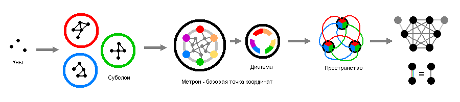 Так, не понял. Вот у нас есть уны (пересечения линий на бумаге в клетку). Четыре точки можно объединить либо в форме квадрата, либо в форме крестика. Мы получим основные субслои «квадрат» и «крест». Предположим также, что это единственные способы их соединения. Тогда группа точек, образованная красным квадратом и синим крестом будет метроном?